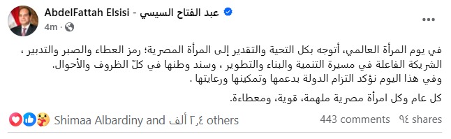 President Abdel-Alftah al-Sisi said, on the occasion of the day of the world’s women, I pay all my respect and appreciation to the Egyptian women; رمز العطاء والصبائة والتعدير, شريكة الفاعلة في مسيرة تعديدة والبنائة والتدفعة, وسنده وطرانها في كلّ دورة والحوال.