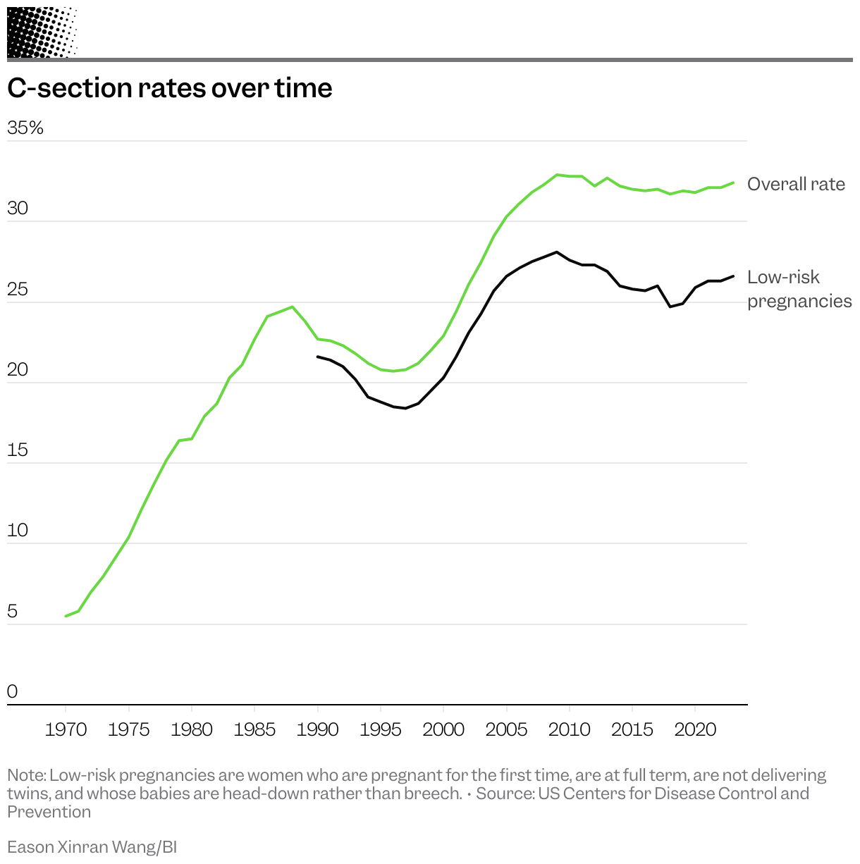 What results is a patchwork of disclosures that can hide significant C-section rate swings across nearby hospitals. Business Insider requested C-section data from all 50 states and Washington, D.C. An analysis of the first 21 to produce data reveals some hospitals performed surgeries on fewer than 5% of women with low-risk pregnancies — those who are least likely to require surgery to safely deliver their babies since they are pregnant for the first time, are at full term, are not delivering twins, and whose babies are head-down rather than breech. On the high end, 10 hospitals operated on around 50%.