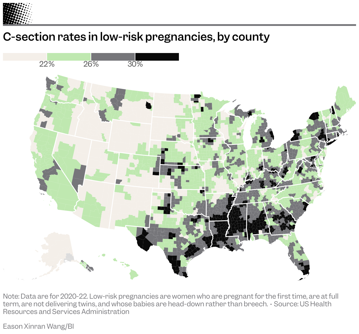 Business Insider identified similar patterns of hospitals declining to disclose to Leapfrog comparatively high C-section rates for low-risk pregnancies in Alaska, Maine, Maryland, Massachusetts, Mississippi, Nevada, Rhode Island, Vermont, Washington, and Wisconsin.