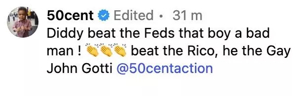 50 Cent also shared an image of himself, created using AI, as he wrote: “Diddy beat the Feds that boy a bad man! beat the Rico, he the Gay John Gotti.”