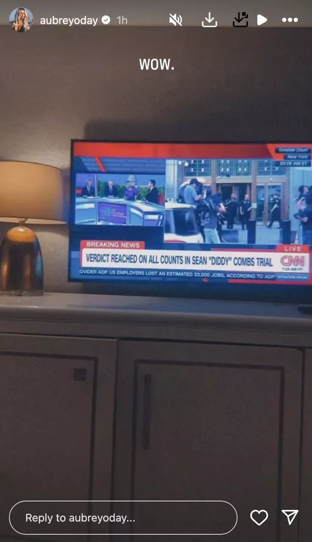 And following the announcement, celebrities took to social media to let their feelings be known. Among them was singer Aubrey O’Day. Taking to her Instagram Stories, she shared a clip of reports of the verdict.