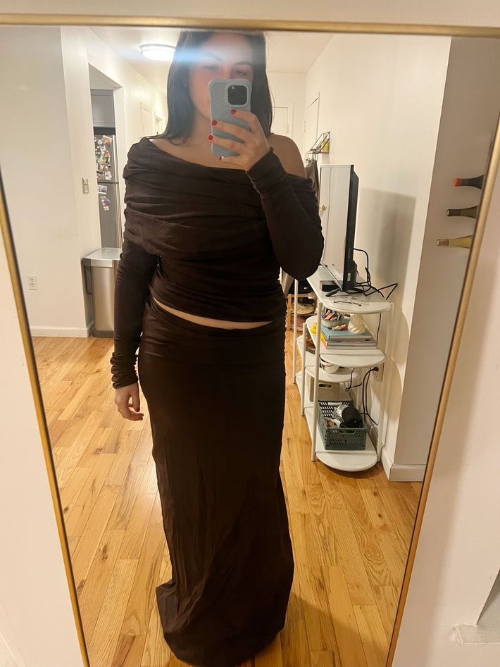 How did it fit? A few months ago, I sat across from our fashion writer, Danya Issawi, at a dinner, and she had on the Bound top. It looked so good that I wouldn’t stop asking her about it. Since then, I’ve been dying to get my hands on one. Entire Studios is oversized and playful, which is my whole thing. The top was great, although I could have sized down to a small for a tighter fit across my chest. However, the medium is perfect to play around with. I knew how to put it on since I spent some time in the showroom (the ruched side is on the bottom). I was nervous about the skirt, but I loved it, especially all together. It fits so well and really complimented the top. Plus, the brown is gorgeous.