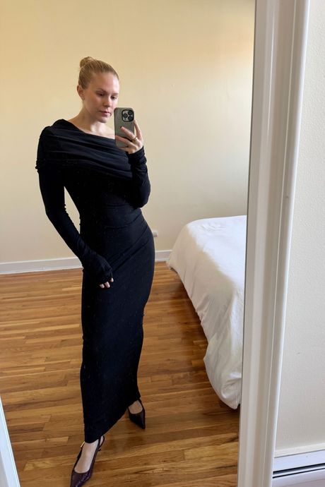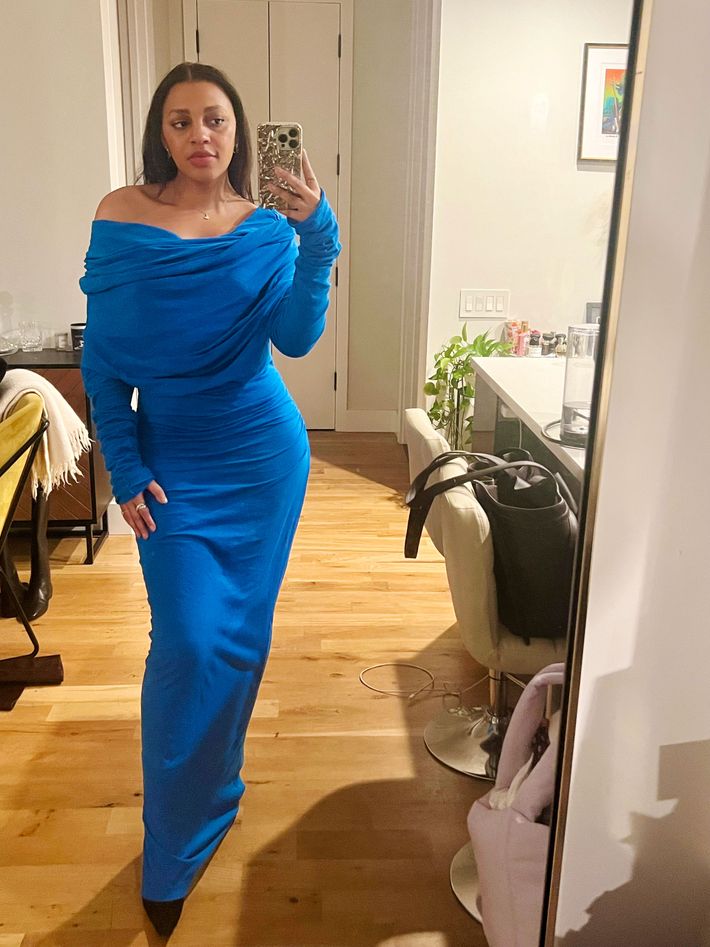 How Did It Fit? Really stretchy, slouchy, and oversized. I was a little scared when I unboxed these, to be honest. Even though the fabric is supersoft and high quality, it’s also extremely lightweight and thin, so I knew it would show everything. But when I finally figured out how to put them on (the longer side is actually the top part and goes over your head), I was pleasantly surprised by how flattering they were. Since each piece has so much extra fabric, there is room to play; I was able to manipulate the fit and customize it to my body type. I made the necklines asymmetrical since I have broad shoulders, and scrunched up the fabric in certain areas to make the drape more flattering. Even though they looked better than I thought they would, I wasn’t completely comfortable in either one. The ultraloose fit didn’t hold me in or make me feel secure. I definitely should have sized down to an extra-small. (For reference: I’m a true size 4 in bottoms and usually between sizes 4 and 6 in dresses.)