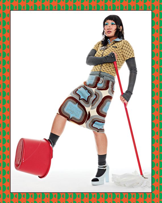 MIU MIU Shirts, Skirt, Brief, Arm Warmers, Socks, and Necklace, at select boutiques and miumiu.com. CHANEL Mary Janes, available at select boutiques. Glasses talent’s own.