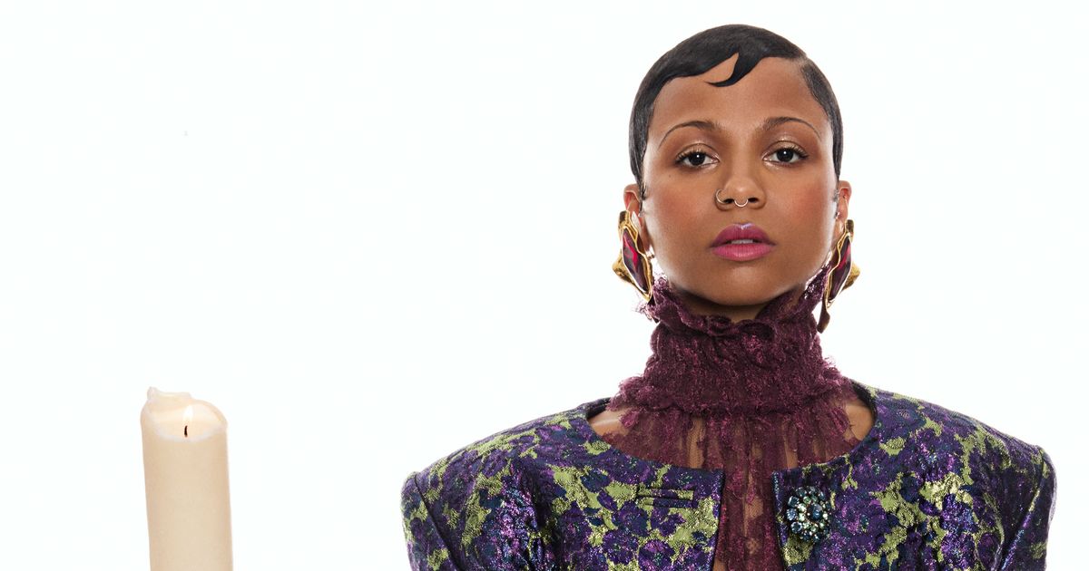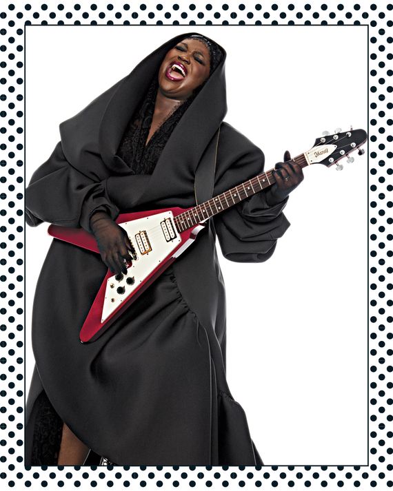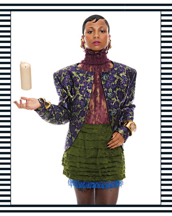 Industry’s Myha’la. SAINT LAURENT by Anthony Vaccarello Brocade Jacket, Lace Bodysuit, Miniskirt, Earrings, Cuffs, and Tights, at ysl.com Photo: Rowan Wade