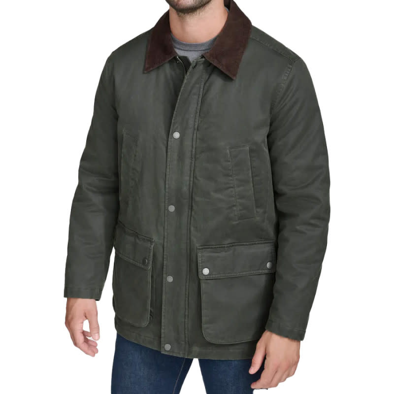 This jacket features a cotton-poly shell fabric with a wax coating to ward off rain and splashes, and it’s stuffed with polyester insulation for extra warmth on cold days—a key differentiator from lighter waxed canvas jackets. The polyester liner makes it easy to slip on and off, and it’s cut to fall at hip length, so you get some extra coverage. Two slash side pockets and two spacious button-flap pockets at the waist give you plenty of storage, and it’s topped with a handsome corduroy spread collar.