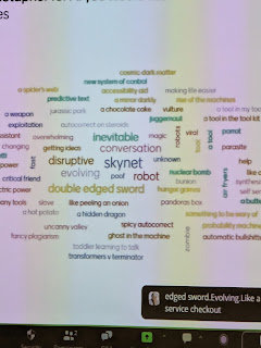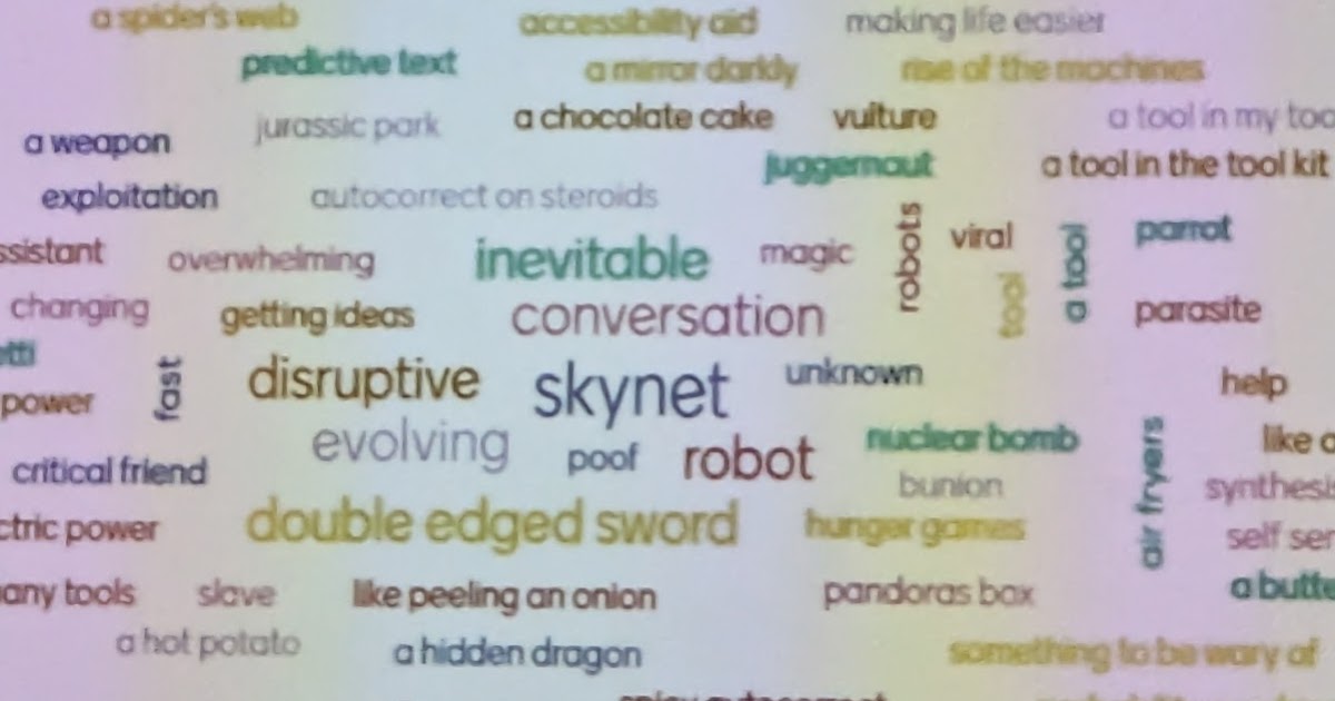 Maha then began her presentation and reminded us that AI can’t be considered inevitable, beneficial or transformative, and we need to acknowledge the risks of AI and stay vigilant. Maha had a visually impaired student who makes use of BeMyAI to provide textual descriptions of pictures, and saying how useful this was to make information more accessible and understand visual information. AI is not a neutral technology, so it’s important to think about social justice and take a critical stance towards AI. Learners in different situations have different needs when it comes to being critical towards AI eg university students vs school students. AI is very oriented towards white western knowledge, and less good with knowledge from the global south. We need to adapt, AI is a shock, so we need to be reflective about the impacts of AI and how to adapt creatively and not just apply knee-jerk reactions. We took part in a Mentimeter poll to share our metaphors of AI (see photo!), and it was clear that there was a lot of ambiguity about our views of AI, people could see the benefits but also the potential challenges, eg “double-edged sword” and “a rose with thorns”. Maha co-authored a paper “assistant parrot or colonizing loudspeaker” which explores metaphors of AI. It explores how metaphors are used, and then the audience was invited to explore some metaphors using a scale developed in the paper to analyze the extent to which the metaphor is critical or positive and the extent to which it is human or inanimate. Different metaphors will give you a different impression of what AI can do, and whether it is negative or positive.