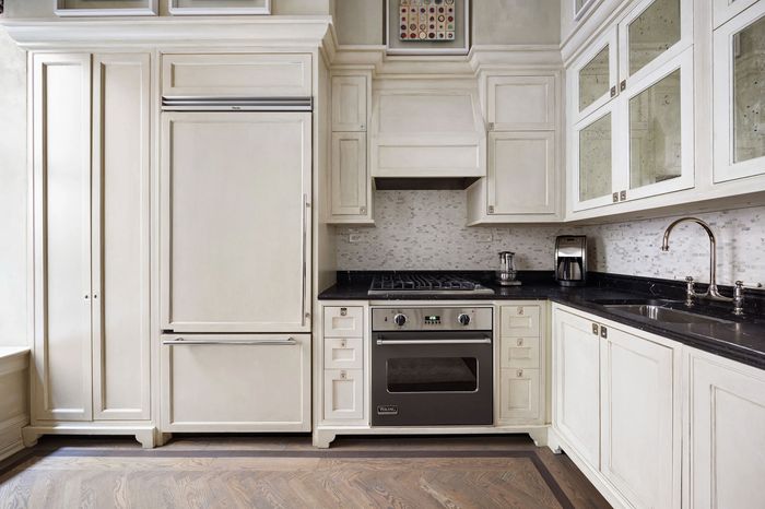 The kitchen, featured in listing photos on StreetEasy and Elegren, has herringbone floors and high-end appliances — finishes to be expected in the upscale condo conversion. Photo: Elegran