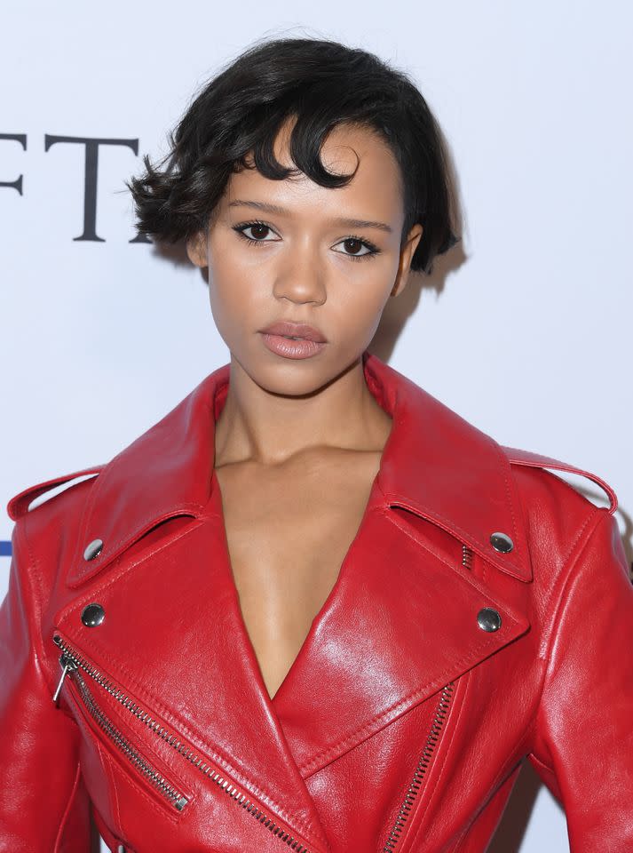 Taylor Russell’s micro-curved bob is created by flipping the longer pieces outwards towards the back of the head. The gelled-down curls on her forehead add to the editorial style.