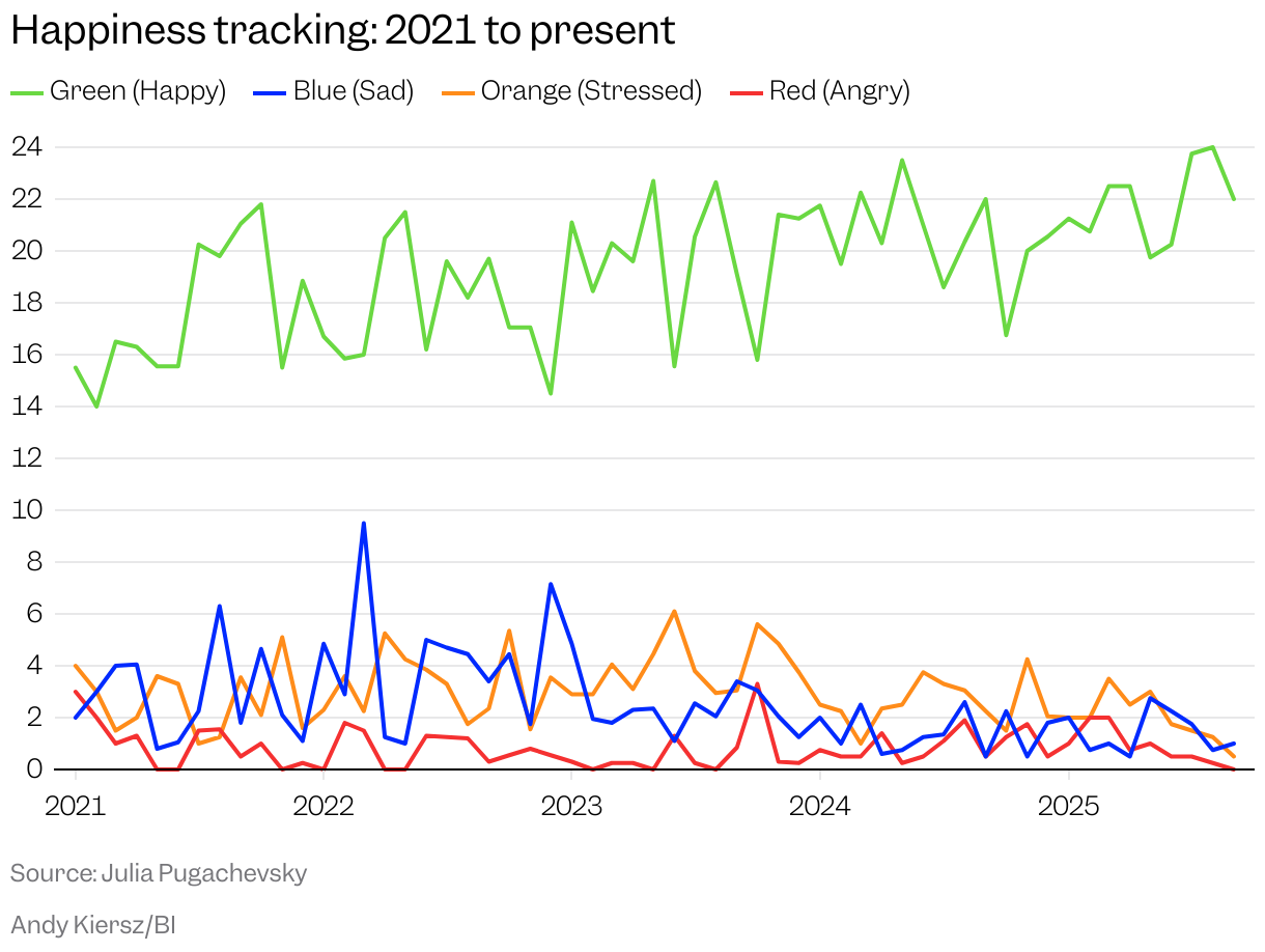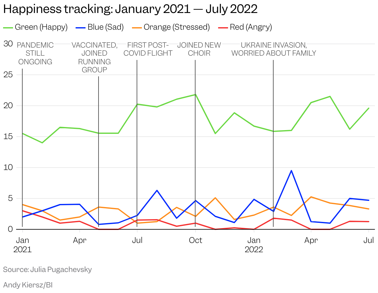 My least-happy years overall were 2021 and 2022. Those years, for me, were defined by the ongoing drag of the pandemic and the terror I felt for my family in Ukraine at the start of the war. Even still, the green line, which denotes my happiness, generally soars above the other emotions.