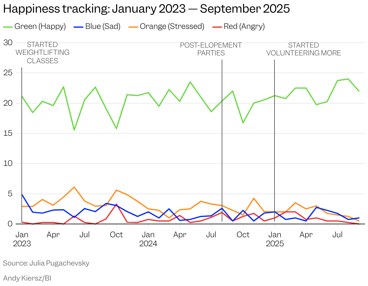 I experienced stress spikes when I first switched roles at work, brought a kitten home, and got engaged, all because I’m prone to catastrophizing. As the chart shows, my happiness jumped up after the initial jitters.