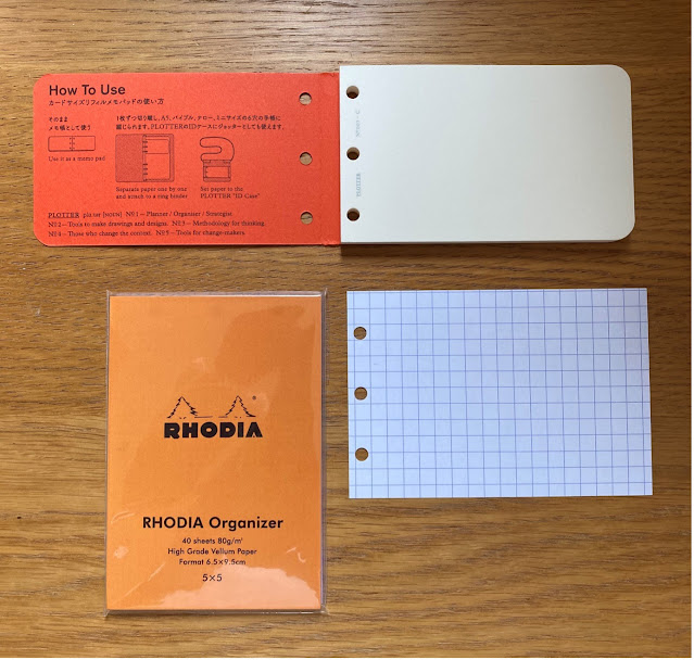For the Plotter models, the dedicated leaves are a “business card” size. Rhodia also offers lovely, punched refills in Japan that are still a perfect fit, but provide some extra writing space. They match the width of Filofax personal size, which appeals to me.