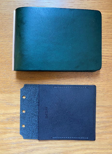 This particular 3-Ring binder is made of Liscio (“tanned, oil-smooth authentic Italian”) leather, nominally blue but actually green in appearance. It has 11mm silver Krause rings and a pink gold backplate. I think it was a limited edition, which came with a matching “ring supporter” to help prevent indentations from the rings. The design is very minimalist, but you can purchase a leather card holder insert to provide a pocket if desired.