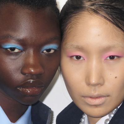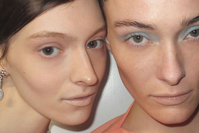 “This season, I created mannequin latex lips and doll eyes with washes of custom mixed colors pulled straight from the collection,” Fara Homidi, the makeup artist behind the looks, told the Cut. “The skin was glowing and healthy thanks to my Fara Homidi Essential Face Compact and buffer brush to give a breathable airbrush quality to it.”