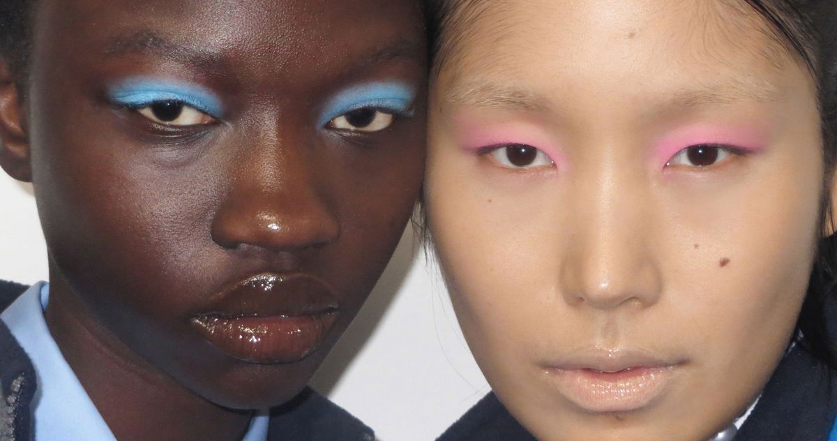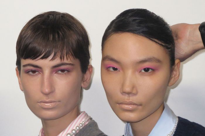 Sandy Liang’s most recent showing at New York Fashion Week was like a time machine, taking us back to this bygone era of beauty. While the clothes were evocative of early-aughts fashion (miniskirts with ankle leggings), it was the lip concealer coming down the runway that really sealed the deal. The models at Liang’s show were mostly barefaced (with copious skin prep using Facile beauty), with little to no blush or contouring. Coupled with the nude lips, which felt like an extension of the throwback frosted lips at the designer’s fashion show last year, this lack of contrast and definition created a striking blank canvas. Only the eyes, covered in pastel shadows, stood out.