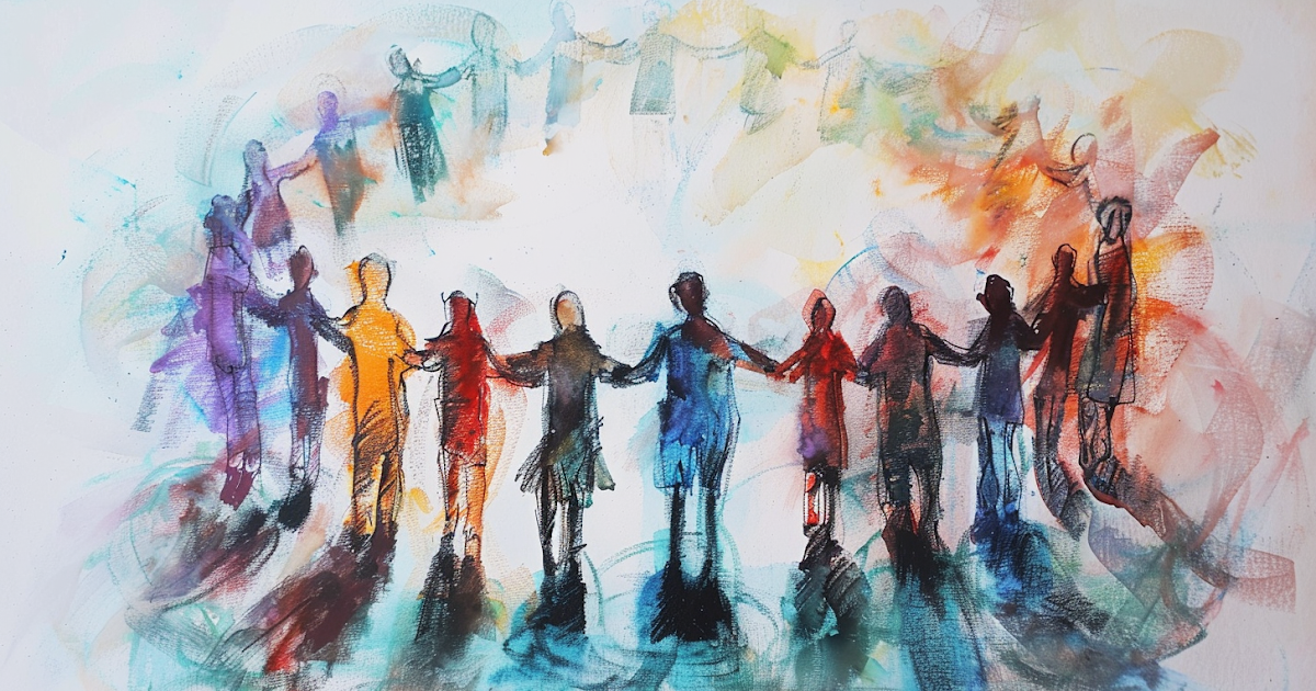 Image by Sheila Webber using Midjourney AI, prompt people in a circle, holding hands, semi-abstract, line drawing, pastel color wash, tranquil –v 6.0 –ar 16:9