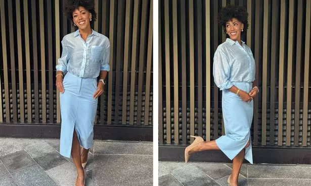 And we’ve found exactly where to shop for her stylish outfit. The shirt is the Blue Oversized Shirt from River Island, but unfortunately sold out online. However, the exact skirt is the Compact Stretch Stab Stitch Tailored Pencil Midi Skirt from Karen Millen, and this tailored midi currently has a huge £90 off.