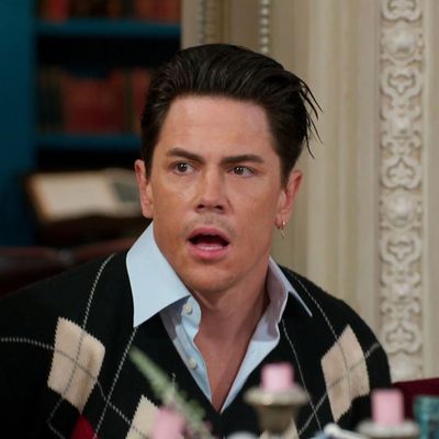 And those who get points for effort (not execution) this episode are Britney Haynes, who is style addicted to wearing a headband since circa 2012, and Dylan Efron, who looks soooooo Hollywood (something previously reserved for his actor brother) in his oversized sunglasses. He saw that Joan Didion Celine ad and said, “I have to have that.” Also, the deep blue of his sweater is making me really want to watch Aquamarine. Tom Sandoval went to dark academia, probably high on the fact that he finally followed a clue correctly in last week’s episode. After surviving murder by the Traitors, he also admitted to feeling so uptight he thought that if he farted, only a dog could hear it. (Yes, he really said that. And may I please direct your attention towards this clip from Gabby Windey’s podcast, in which she reveals that this was a major problem with the men’s colons on set.) But you know what, even though he looked ridiculous during the challenge (this man was getting sprayed by creepy porcelain dolls with some questionable white liquid while crouched over, letting toys whisper sorcery into his ears), that sweater seems to be helping him in the deductive-reasoning department this episode. He found those reversed lullabies and sang his little heart out. Unfortunately, he lost all the meager respectability points he gained within the cast when he misspoke and said women were “better cheaters” instead of “better Traitors.” Freudian slip! As our culture editor noted, “I need a map of his mind.”
