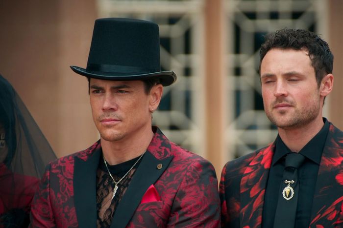 If you have a queasy stomach, both for fashion faux pas and creepy-crawly critters, I urge you to steer clear of this episode. Yes, we have Tom Sandoval in a top hat; yes, we have Sam Asghari’s hair flattening into a bowl cut; yes, we have Britney Haynes dressing exactly how I wanted to when I was 13 (like Blair Waldorf); and yes, we have Carolyn Wiger dressing how I actually did at 13 (like a moody wannabe Tumblr teen). What’s worse, though, is all these women came to work later in the episode only to have their gorgeous looks soiled.