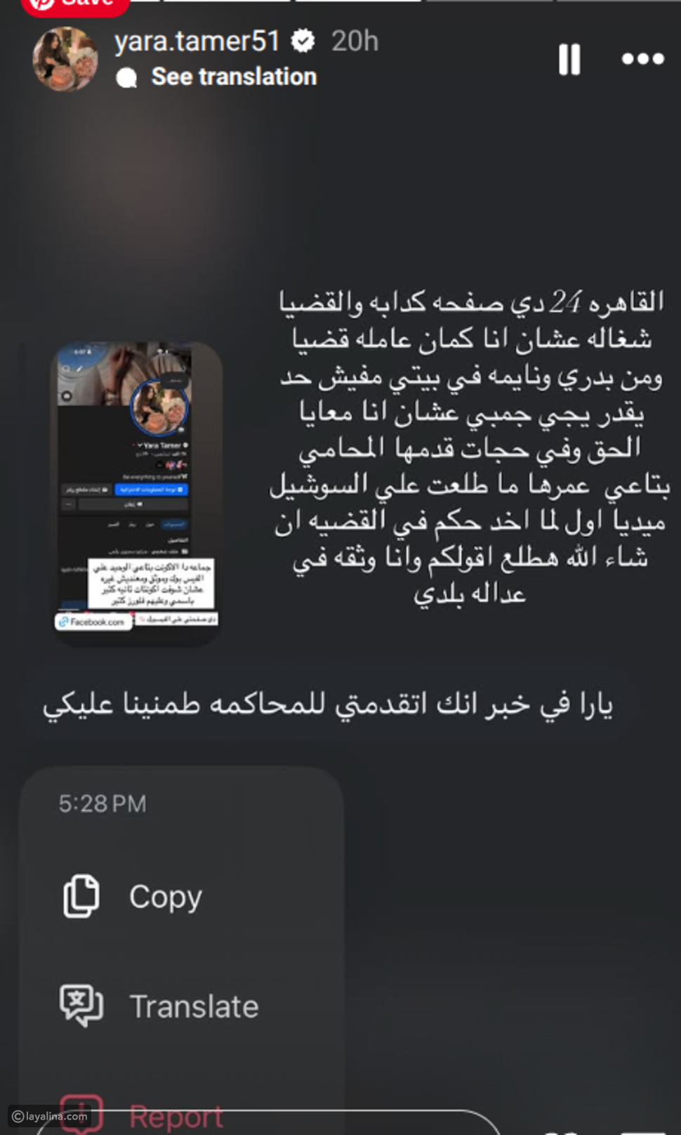 It says the details of the news that the report was registered under number 410 for the year 2025 of the Economic Code, and it was recorded for inspection as a preliminary to the judgment. And in return ردت يارا تامر على هذه الانباء بغرف.