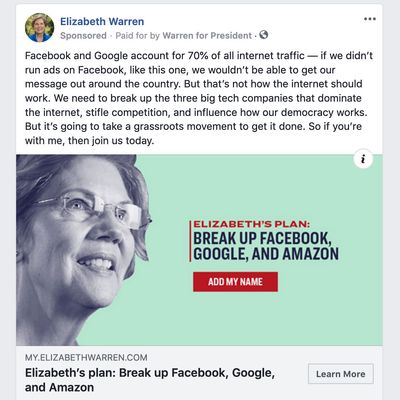 Earlier this week, Democratic presidential candidate Elizabeth Warren unveiled a series of policy proposals intended to curb the significant power of Silicon Valley’s biggest firms. (Facebook, Google, and Amazon got name-checked in the announcement, and Warren has since confirmed that her policies could also apply to companies like Apple.) She decided to let people know about the looming power of Big Tech by doing what most organizations do when they really want attention: she bought a Facebook ad.