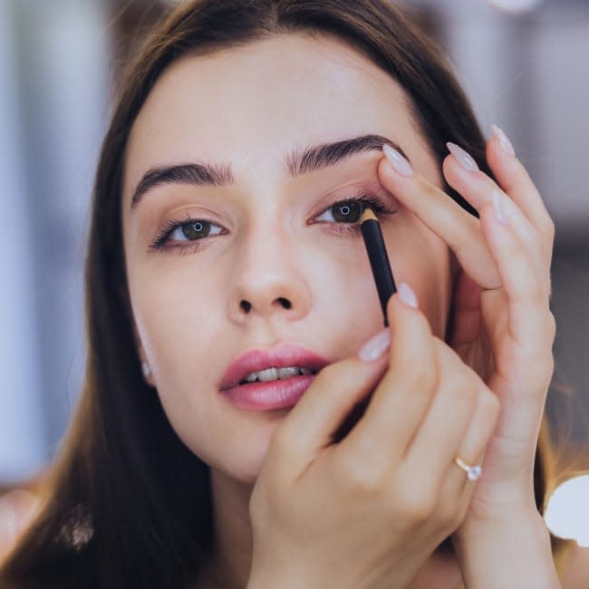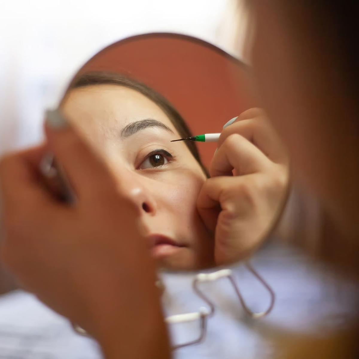 Taylor recommends using a small pencil liner—she loves L’Oreal Infallible—and applying it directly on the bed of the lash. “Whether you have to get a bigger mirror, do so,” she says. The key is to avoid pulling the skin, which can cause crinkles or uneven lines. Instead, gently press the liner along the lash line, creating a smooth base.