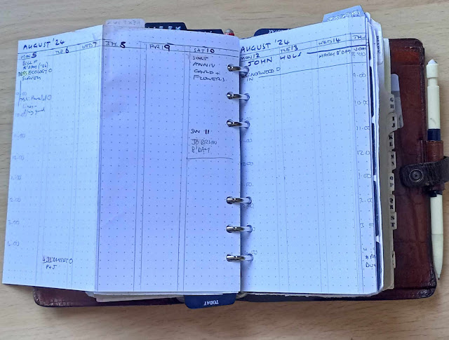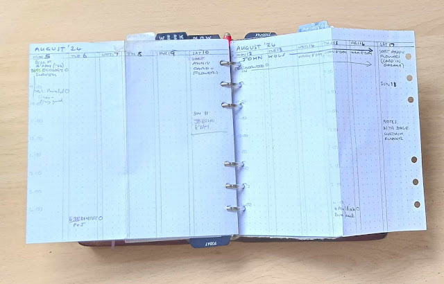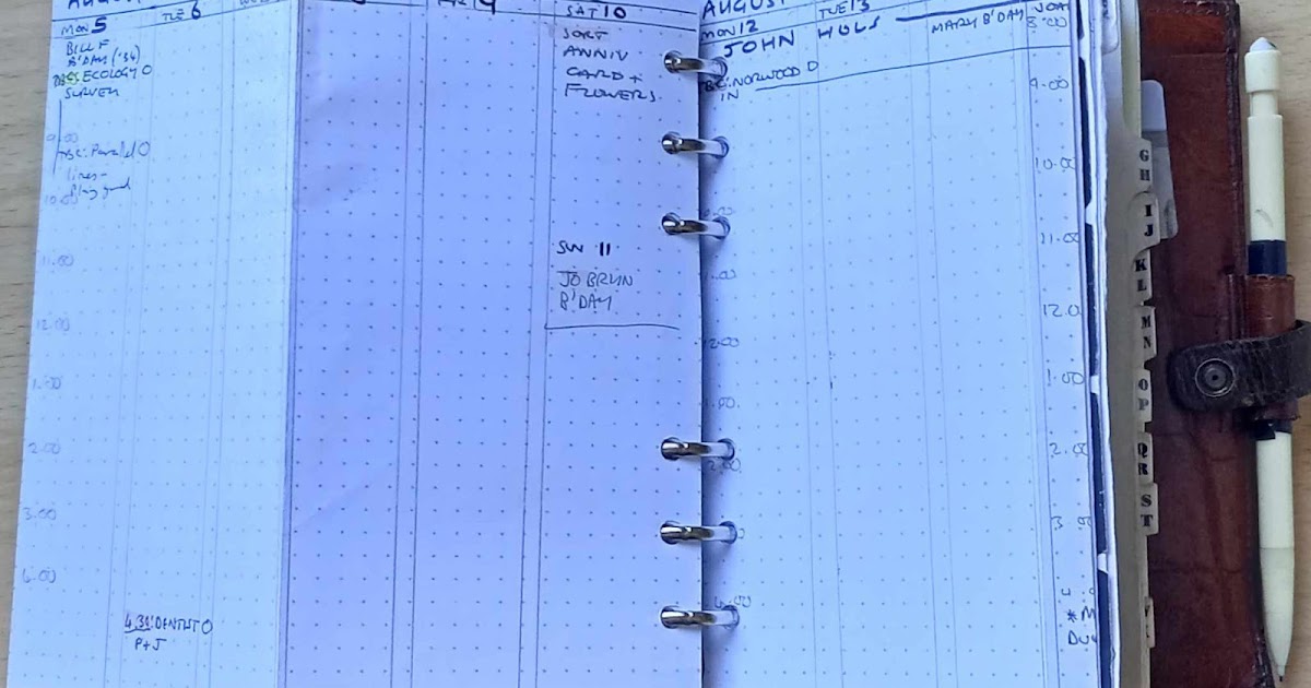The other factor is the need for visibility of two weeks at a time while I’m out and about. The only solution I could think of was a two page week to view – by folding out, with the five days of the week getting top billing and the weekend gets just one vertical column, as this is all I need. You’ll also see that I don’t use these pages for to-do lists as I use a mini Finsbury for those.