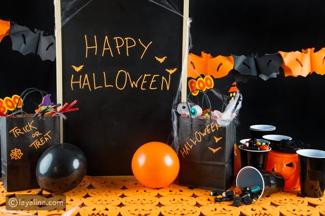 Halloween decorations can be prepared using simple tools made of strong black paper, scissors and string, for example, making a group of decorative balloons or small spiders from black paper, and hanging them on the wall. واستغلي البرتمانات الفرغة or empty water bottles to make inexpensive decorations for Halloween by painting them orange and drawing scary and funny faces on them, putting small lamps in different colors.