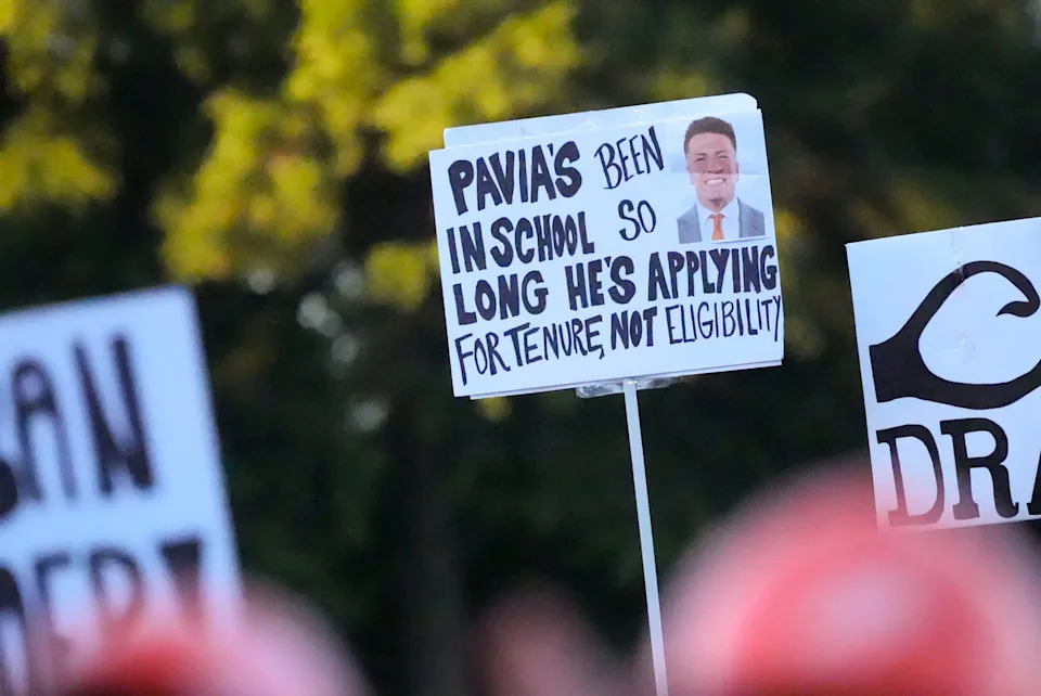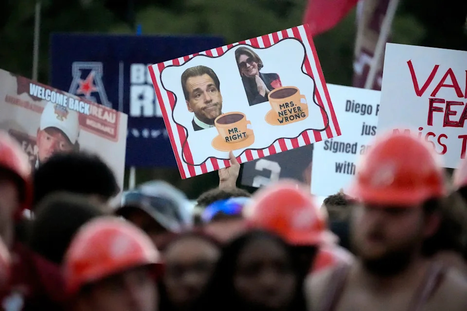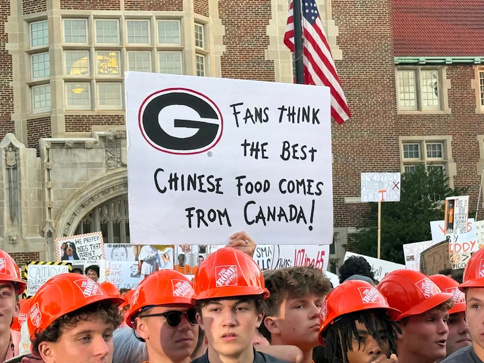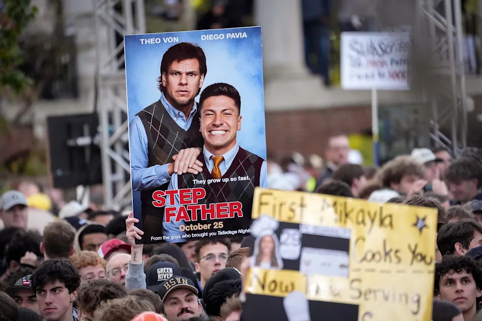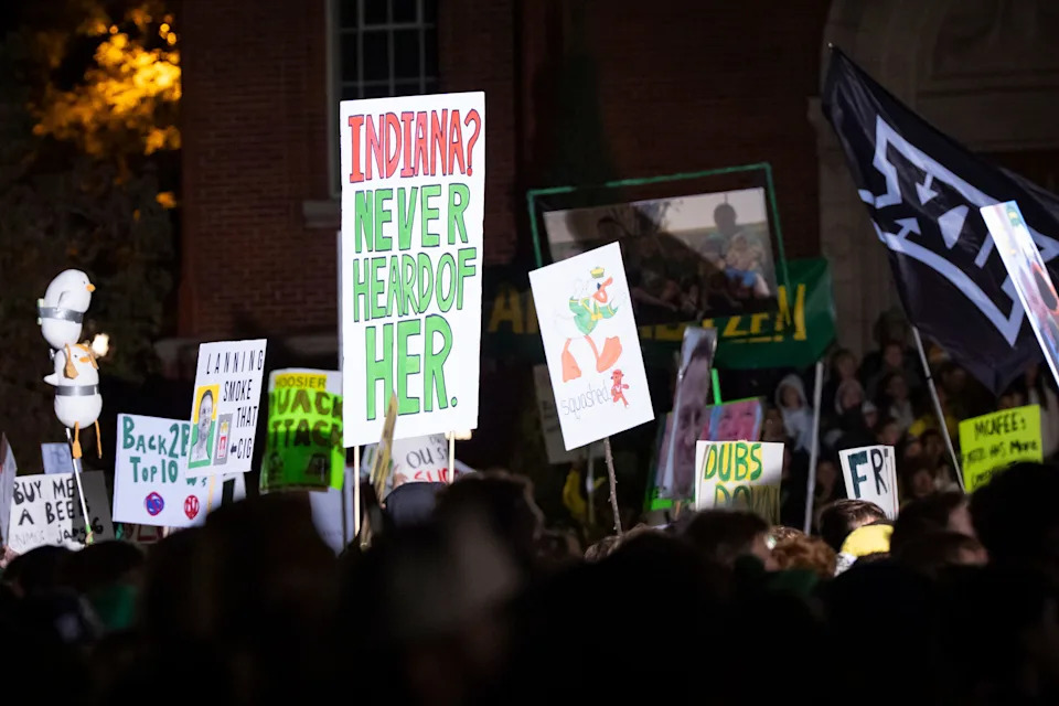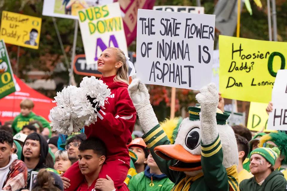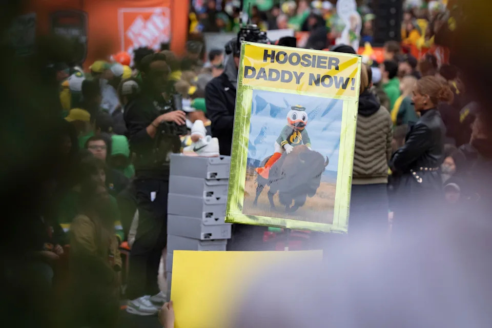 Signs during ESPN’s “College GameDay” on the campus of the University of Oregon on Oct. 11, 2025, in Eugene, Oregon.