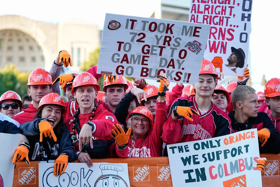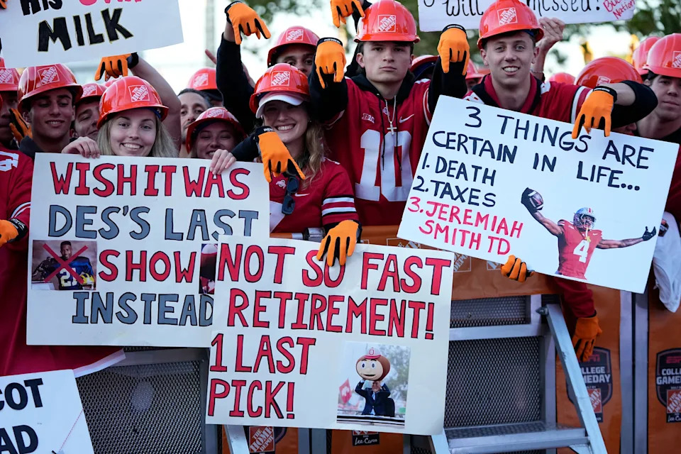 Fans hold signs on the set of ESPN College GameDay prior to the NCAA football game between the Ohio State Buckeyes and the Texas Longhorns at Ohio Stadium on Aug. 30, 2025.