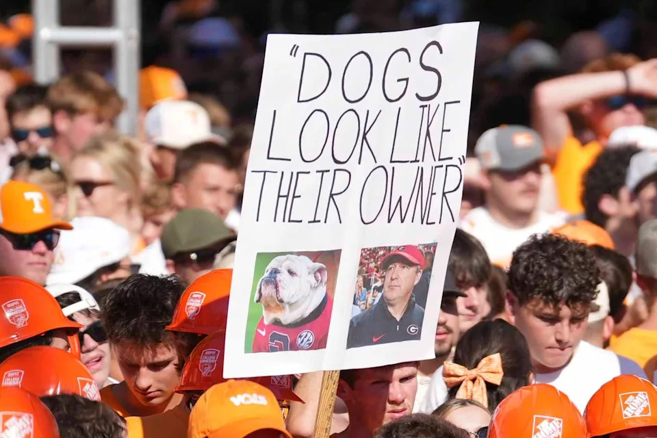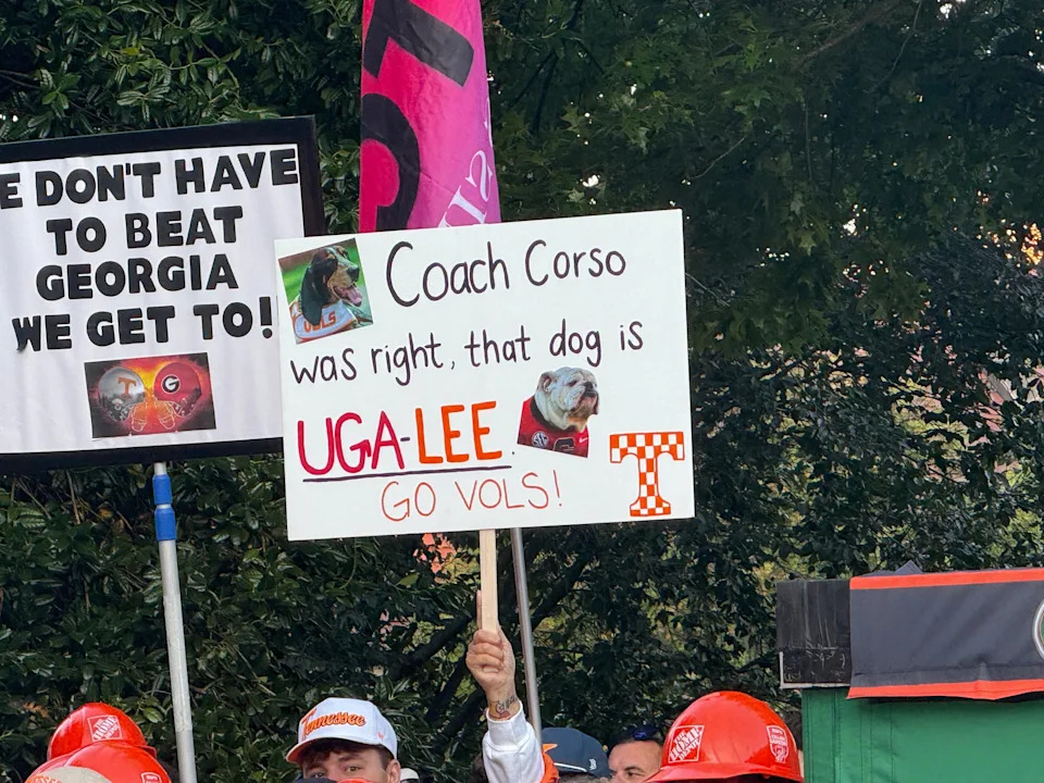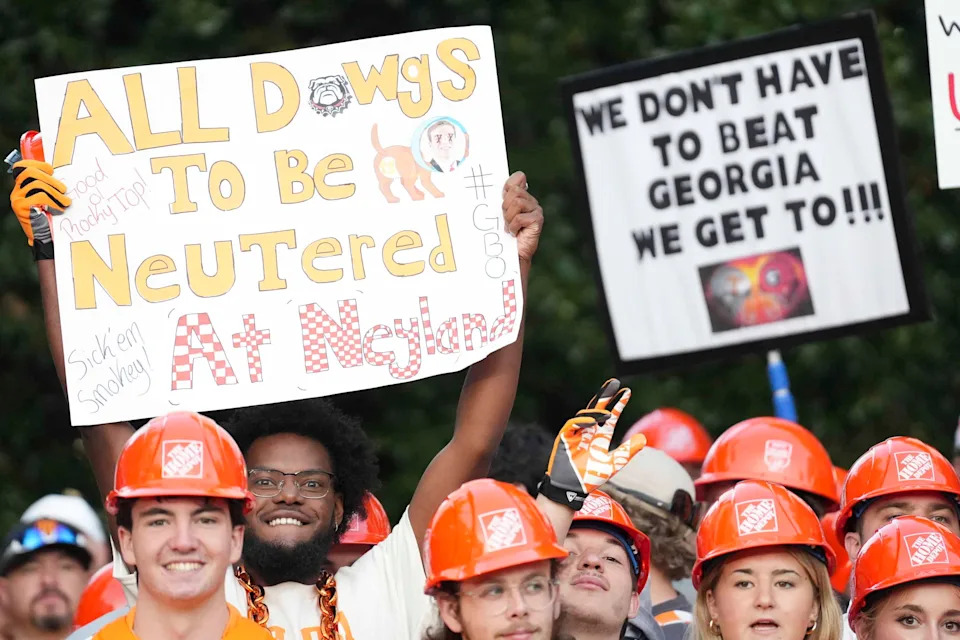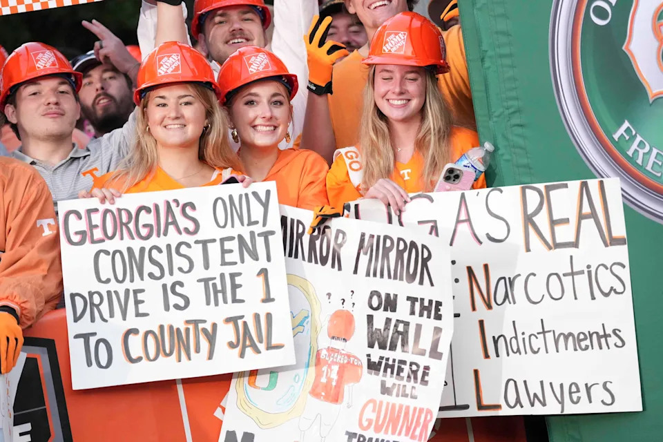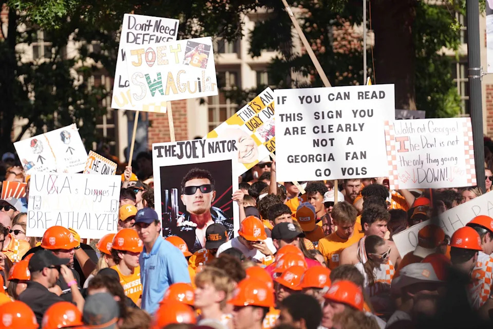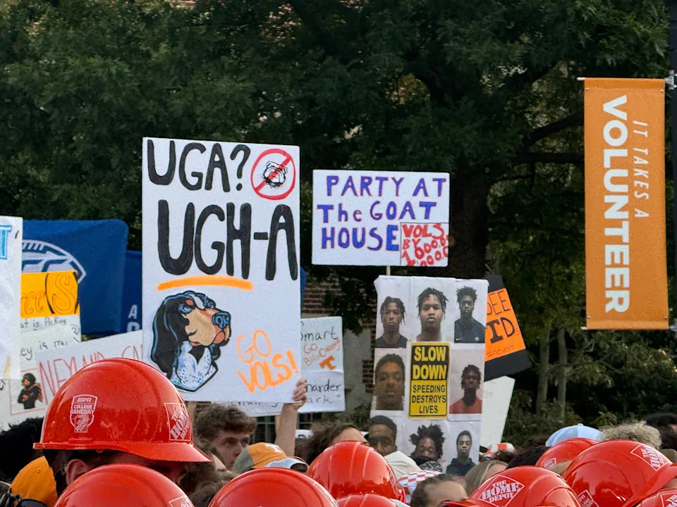 Fans cheer with signs at ESPN “College GameDay” in front of Ayres Hall on the University of Tennessee at Knoxville campus Saturday, Sept. 13, 2025, before the No. 15 Tennessee Volunteers host the No. 3 Georgia Bulldogs.