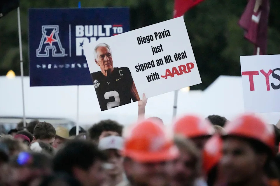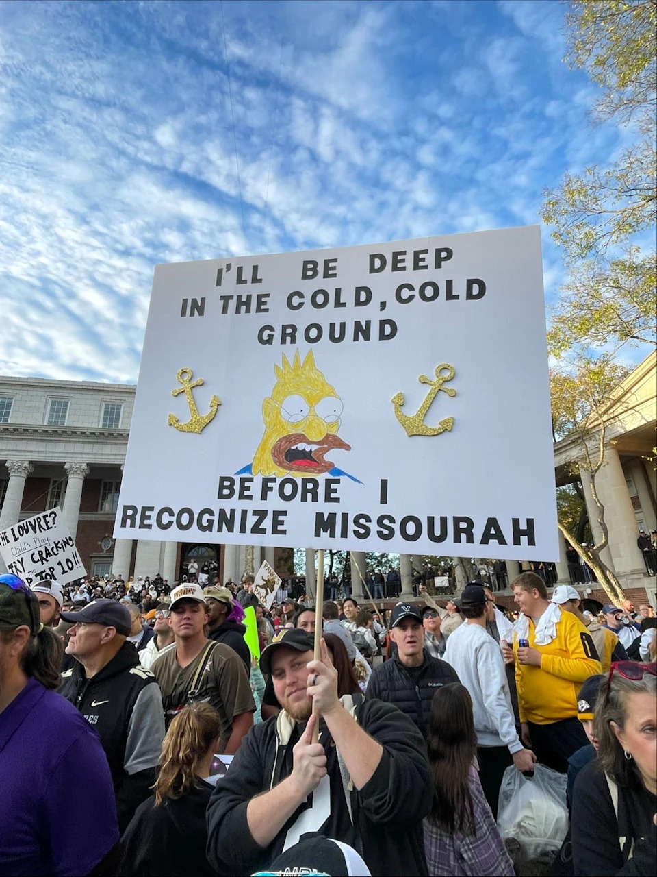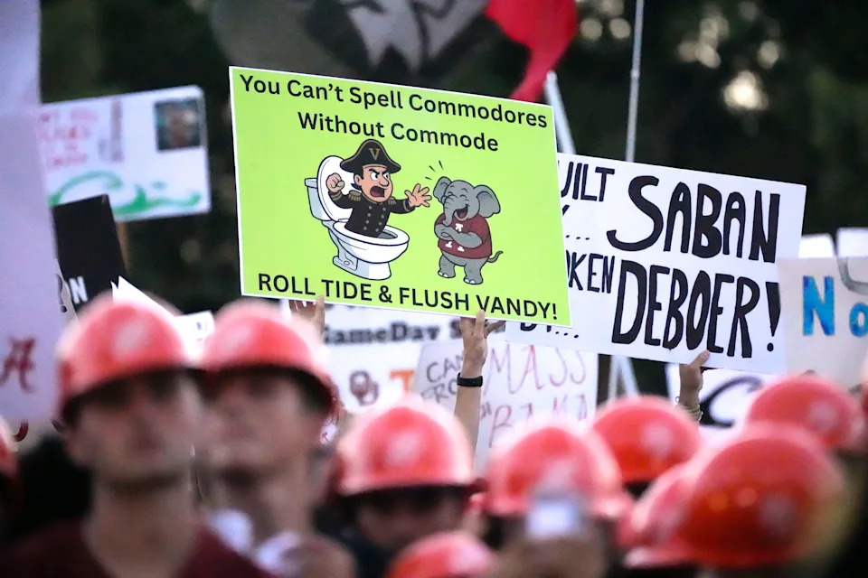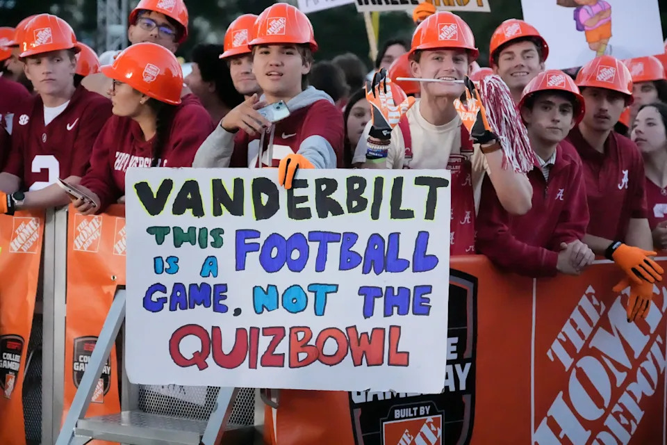 Fans cheer with signs during ESPN “College GameDay” at Wyatt Lawn on the campus of Vanderbilt University in Nashville, Tenn., Saturday, Oct. 25, 2025 before Vanderbilt hosts Missouri.