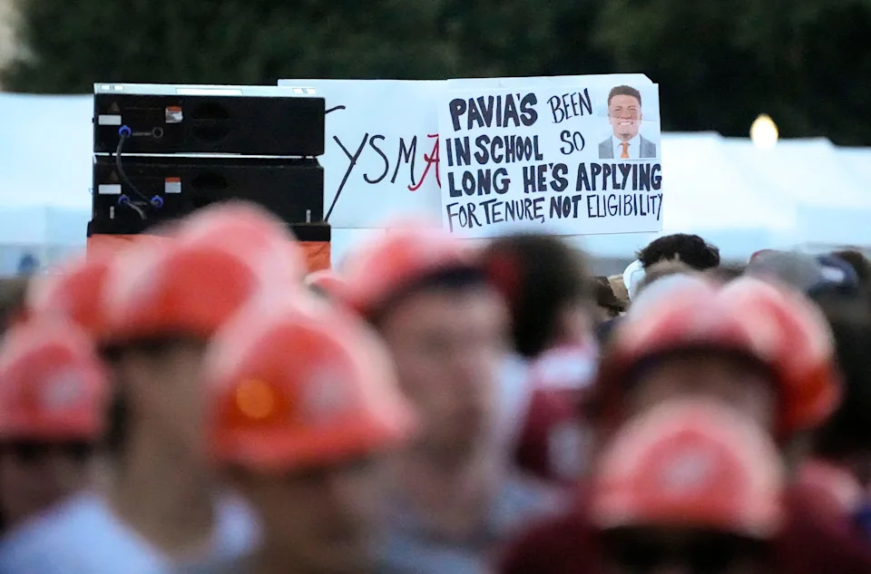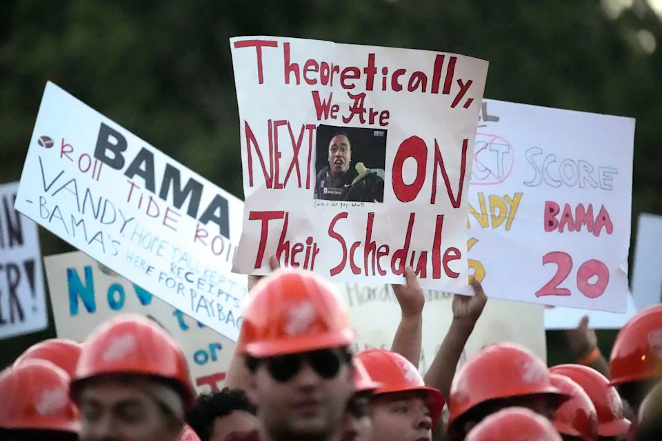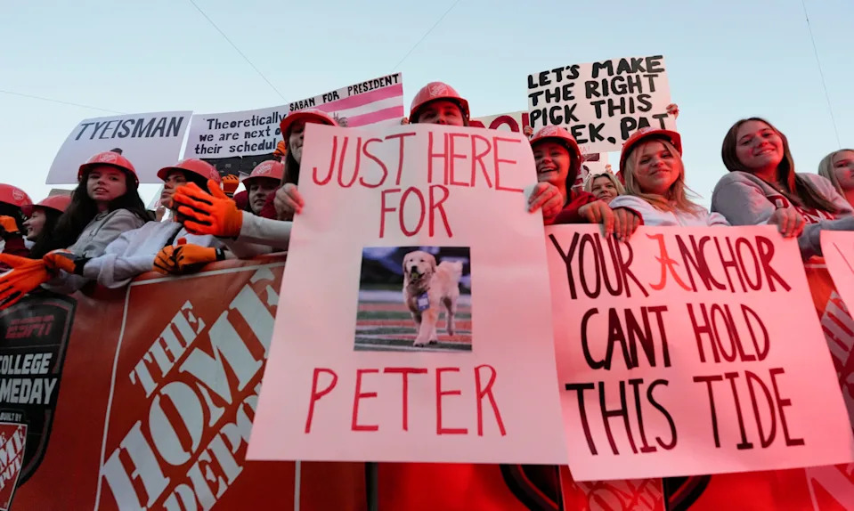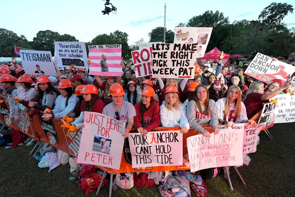 Oct. 4, 2025; Tuscaloosa, Alabama, USA; Alabama fans hold up signs during ESPN’s College GameDay on location on the Quad at the University of Alabama before the Alabama versus Vanderbilt game.
