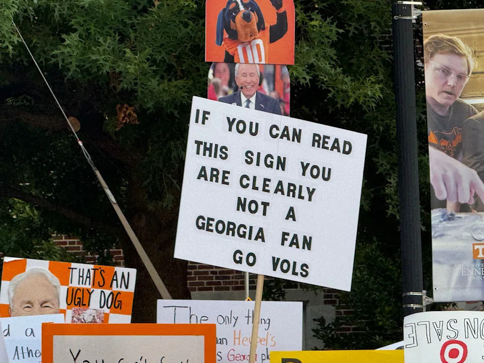 Fans hold signs at ESPN’s “College GameDay” in front of Ayres Hall on University of Tennessee Knoxville’s campus, Saturday, September 13, 2025.