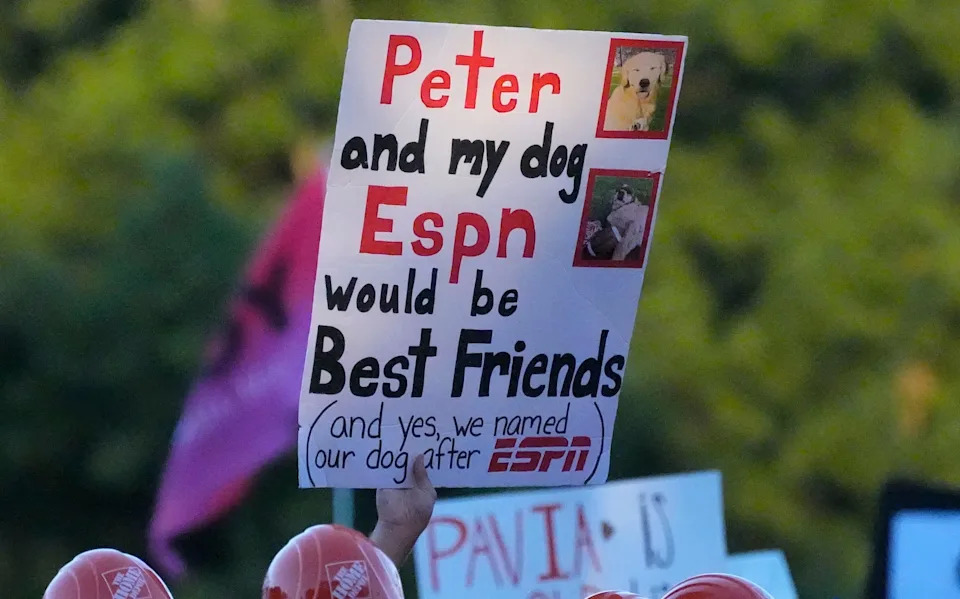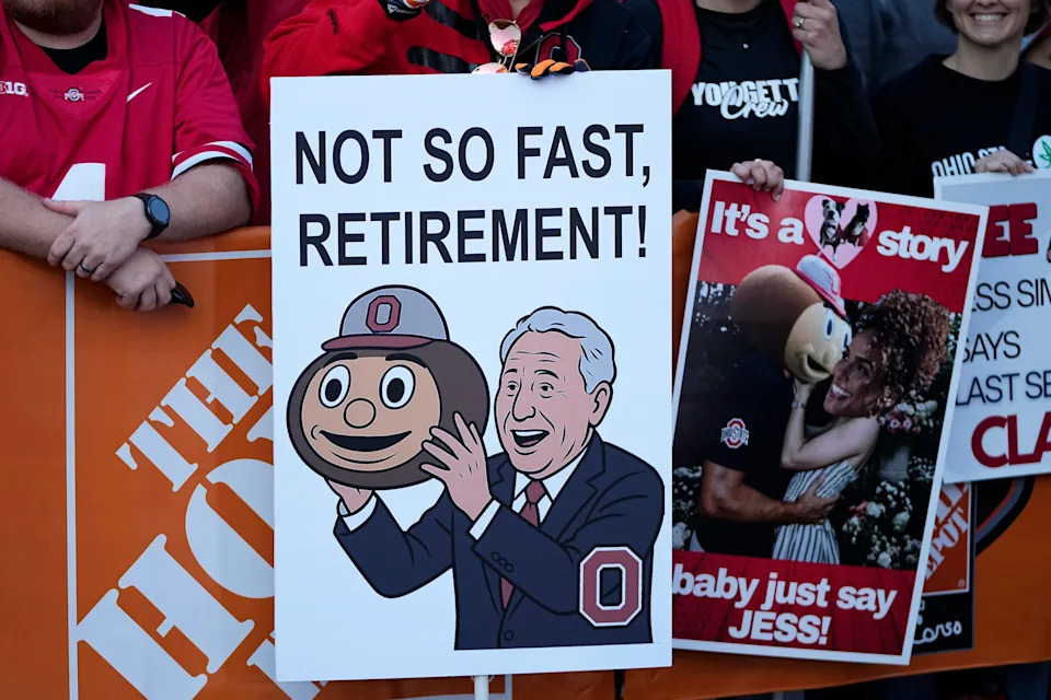 Fans hold signs in support of Lee Corso on the set of ESPN College GameDay prior to the NCAA football game between the Ohio State Buckeyes and the Texas Longhorns at Ohio Stadium on Aug. 30, 2025.