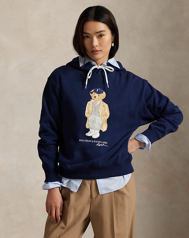 Ralph Lauren’s lineup of Polo Bear hoodies includes two cozy fleece styles and one elevated cotton-linen knit option that bridges the gap between sweater and sweatshirt.
