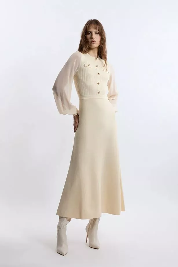 Touted as an elevated eveningwear piece, this knit dress features a silhouette that skims the curves to create a figure-flattering fit. Boasting sheer, chiffon sleeves with a balloon cut, this Karen Millen midi seamlessly balances timeless sophistication with a playful twist, making it ideal for a range of occasions.