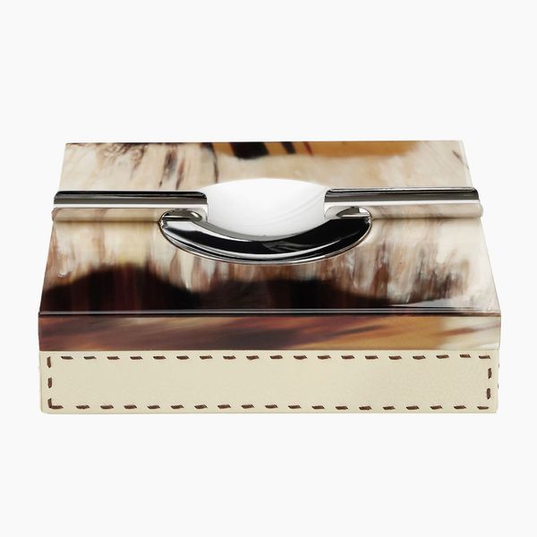 Perhaps the chicest ashtray ever? It features a glossy finish, chromed brass round tray and matching cigarette holders, leather sides, and hand-sewn contrasting stitching. The natural color scheme will match any room in their home.