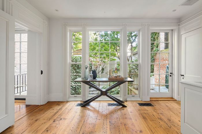 The rear parlor at 64 Bedford Street looks into the gardens. Both houses have been upgraded, but wide-plank flooring maintains their 1840s patina. Photo: Zoe Wetherall/Duplex Imaging NYC