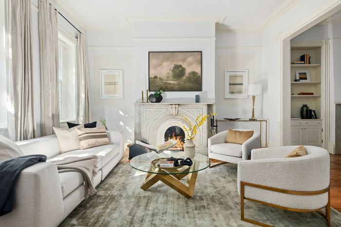The living room of 64 Bedford Street with an original fireplace. Photo: Zoe Wetherall/Duplex Imaging NYC
