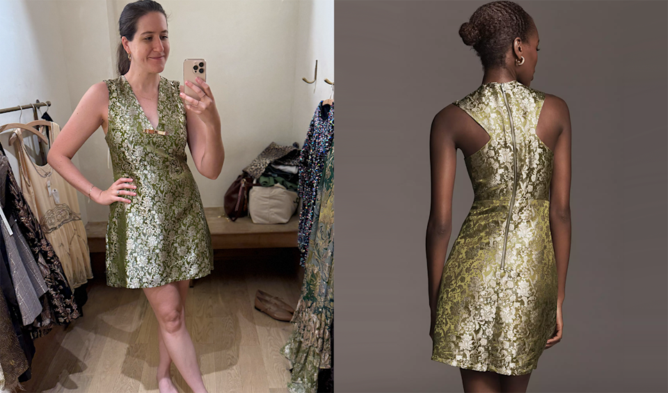 The photos barely do this stunning green brocade justice, it was even more gorgeous IRL. And while the fabric alone would have been enough to sell me on this cutie, the addition of a small gold metal bow on the front made it simply irresistible. I also love the exaggerated racerback detailing, although it does mean you will need to wear a racerback, cross-back or strapless bra. The fit was also spot on—true to size, flattering and comfortable—and comes in both plus and petite sizes. And while some reviewers didn’t love how light the material is, I thought it a major plus to avoid feeling constricted as you indulge on all the holiday appetizers and Champagne.