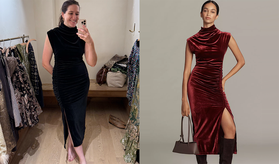 I almost always gravitate towards sparkle, pattern and bright colors, but slipping into this stretch velvet number made me feel fabulous and surprisingly festive. The material is dreamy soft and has ample stretch to comfortably hug your curves. That said, I’d stick with your usual size when ordering to avoid any odd pulling that might occur if you size down. While the silhouette is form-fitting and there is a leg slit that goes about mid-thigh, the high neck and ruching along the bodice help balance everything out to hit just the right level of sexy that I’d feel comfortable wearing this midi at all kinds of holiday events. It also comes in a soft metal gray, rich teal and the burgundy pictured above, although not every shade is available in petite or plus sizes.