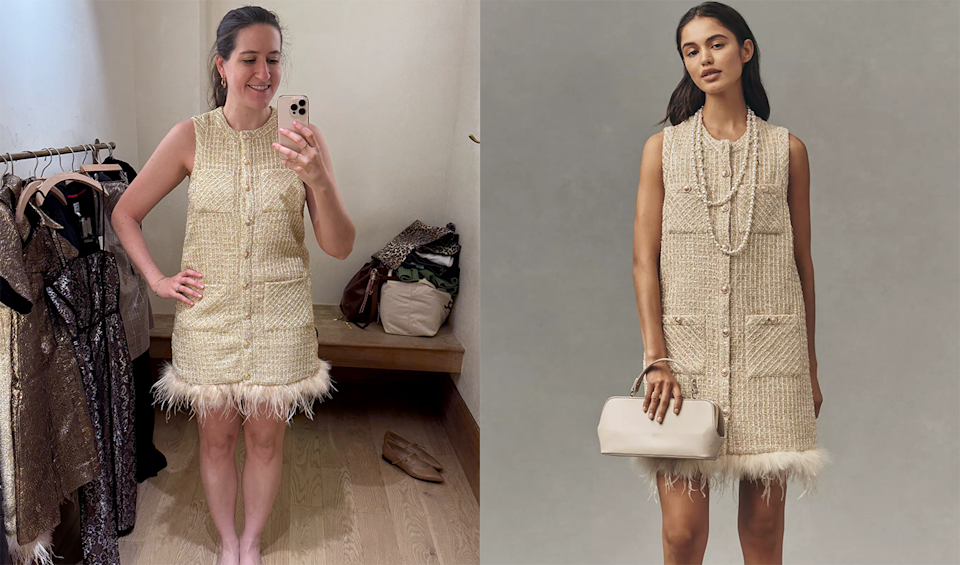 For anyone who bought hard into the Chanel-inspired lady jacket trend, this is the holiday dress for you! The gold tweed has just the right amount of sparkle to feel festive, but not over the top. And while it does come with a feather trim, which cannot reasonably be called subtle, it’s not so “in your face” bold as a fully feathered frock. The buttons down the front are fully functional, giving you some room to play along the neckline and hem and eliminating the need for a zipper. And, yes, the four front pockets are all functional as well, although they won’t hold much more than a lipstick and card case. This was definitely a top contender for me as a comfy-yet-chic option that can work for so many holiday events.