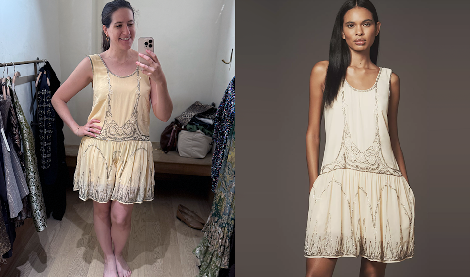 While technically not a dress, this romper is a very fun option for anyone hoping to add a little ’20s vibe to their collection. The lightweight fabric is lovely to touch, and because the whole thing is designed to have an oversized fit, it feels incredibly comfortable when on. With the slouchy silhouette, I assumed I’d want to size down, but I actually think you’re best off sticking with your usual size. The delicate embellishments scream Daisy Buchanan, and I highly recommend leaning into those flapper vibes with your shoes and accessories, too. An extra-long pearl necklace, glittering headband and some Mary Jane heels should do the trick.