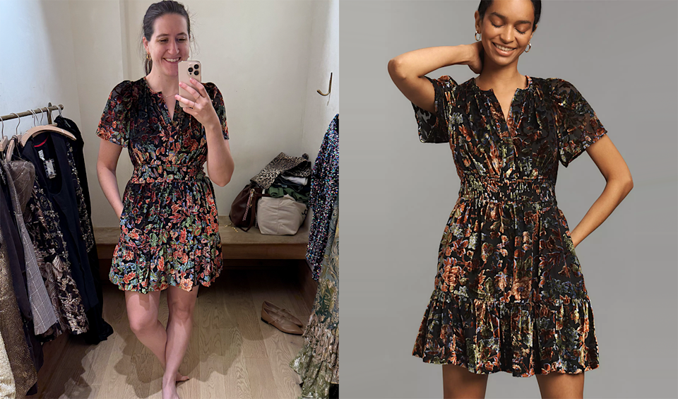 The beloved Anthro Somerset style is a year-round favoritebut for holidays I definitely recommend this mini velvet version. The velvet feels festive and winter-ready, but the colorful pattern helps it stand out from the usual all-black or sequin-adorned frocks. I will note, I typically opt for a medium in the Somerset collection, but greatly preferred the fit of a large with the velvet, so you may want to consider sizing up one from your usual even if you’ve worn this silhouette in the past. That said, this mini has all the same features as the classic cotton version—a flattering V neckline, stretchy smocked waistband, slightly puffed sleeves and two roomy pockets. Now all you need is a pair of black suede boots and some statement earrings, and you’ll be ready to party!