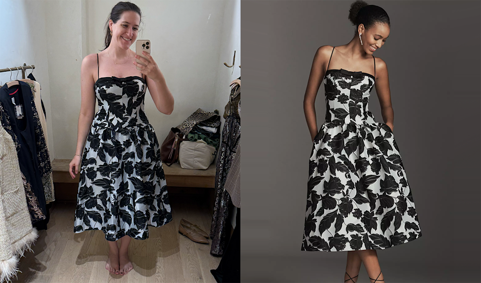 This midi dress feels peak Anthropologie to me—it’s a little bit boho, a little bit vintage and 100 percent guaranteed to ring in all the compliments. The black velvet straps and adjustable bow in back make the super-lightweight metallic material feel more appropriate for winter celebrations, but it doesn’t scream “holiday.” It’s also incredibly comfortable with ample room in the hips and midsection. I will note, that although the material has no stretch to it, this dress definitely runs a little big. I am typically a medium in Anthro brand dresses, but I tried on a small and it fit just fine. And while the straps are, unfortunately, not adjustable, there are petite sizes available so the neckline won’t feel quite so plunging on anyone under 5’3″.