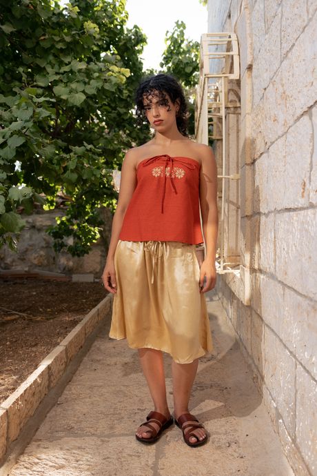 Born in the United States to Palestinian immigrant parents, Mjalli moved back to the West Bank to reunite with her family after graduating from college in North Carolina and has been building Nöl Collective out of Ramallah since 2017. Mjalli incorporates indigenous practices into her work, such as hand-dying fabric with natural dyes made from local plants, insects, and roots; utilizing traditional methods of weaving; and employing a network of locals to hand-embroider much of the clothing, creating a unique blend of modern and traditional Palestinian line work, or tatreez. “It’s our duty to help preserve those crafts and tell their stories,” she says.