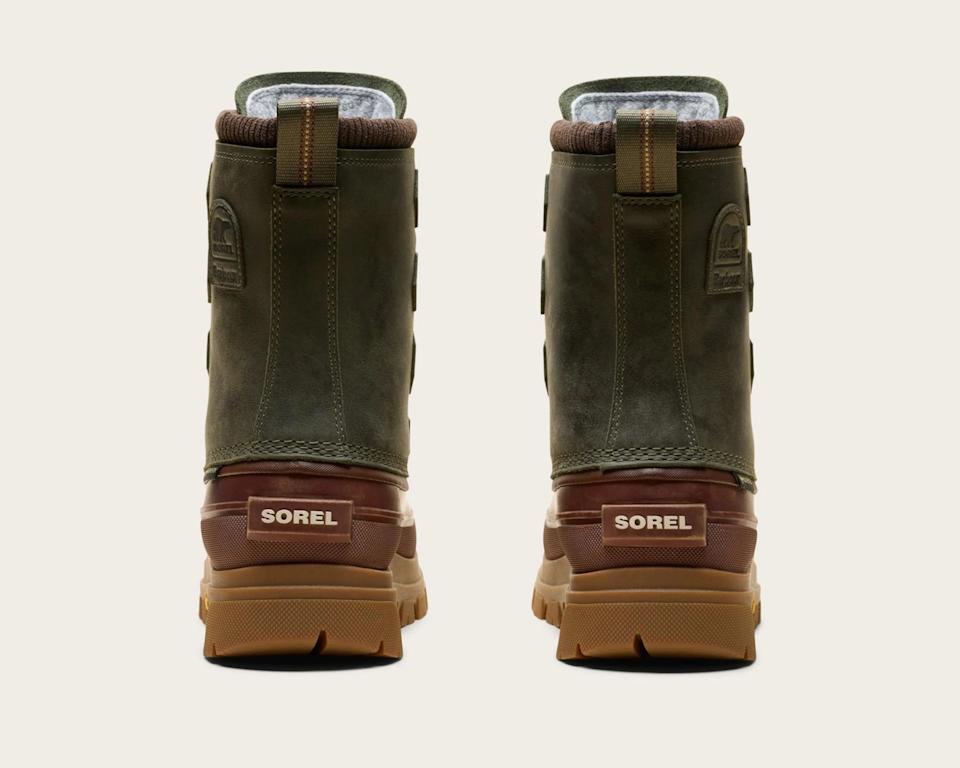 Pair of olive green and brown Sorel winter boots with rubber soles shown from the back.