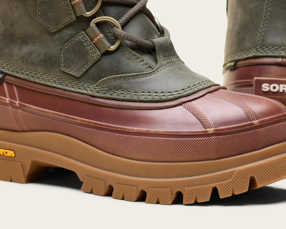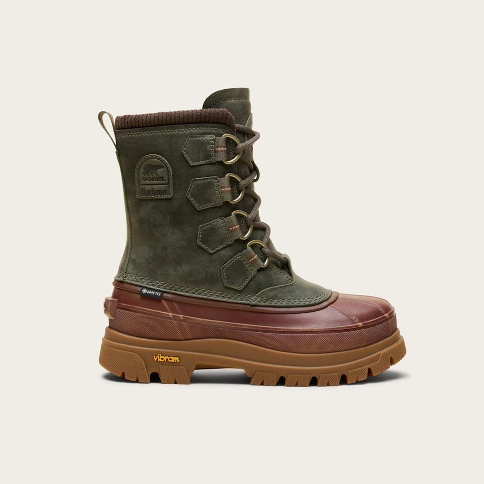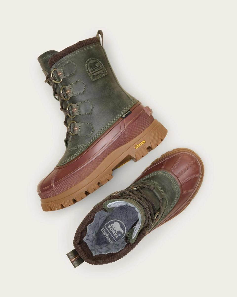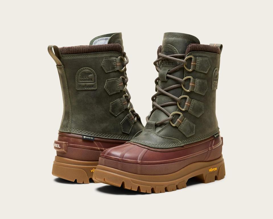 Barbour and Sorel team up for their first collaboration to reimagine the legendarily rugged Caribou boot. – Credit: Sorel