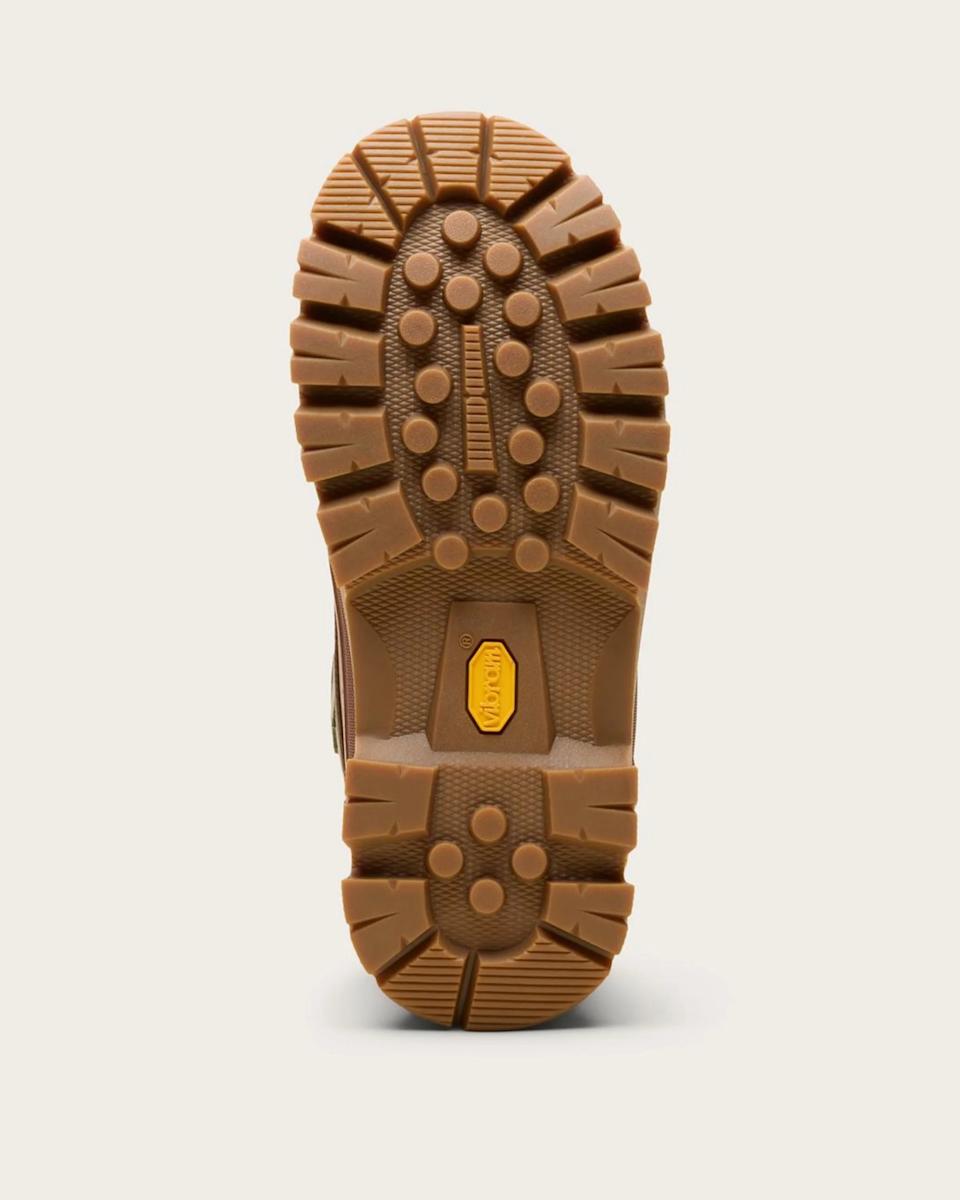 Brown rubber boot sole with deep treads and a yellow Vibram logo in the center.
